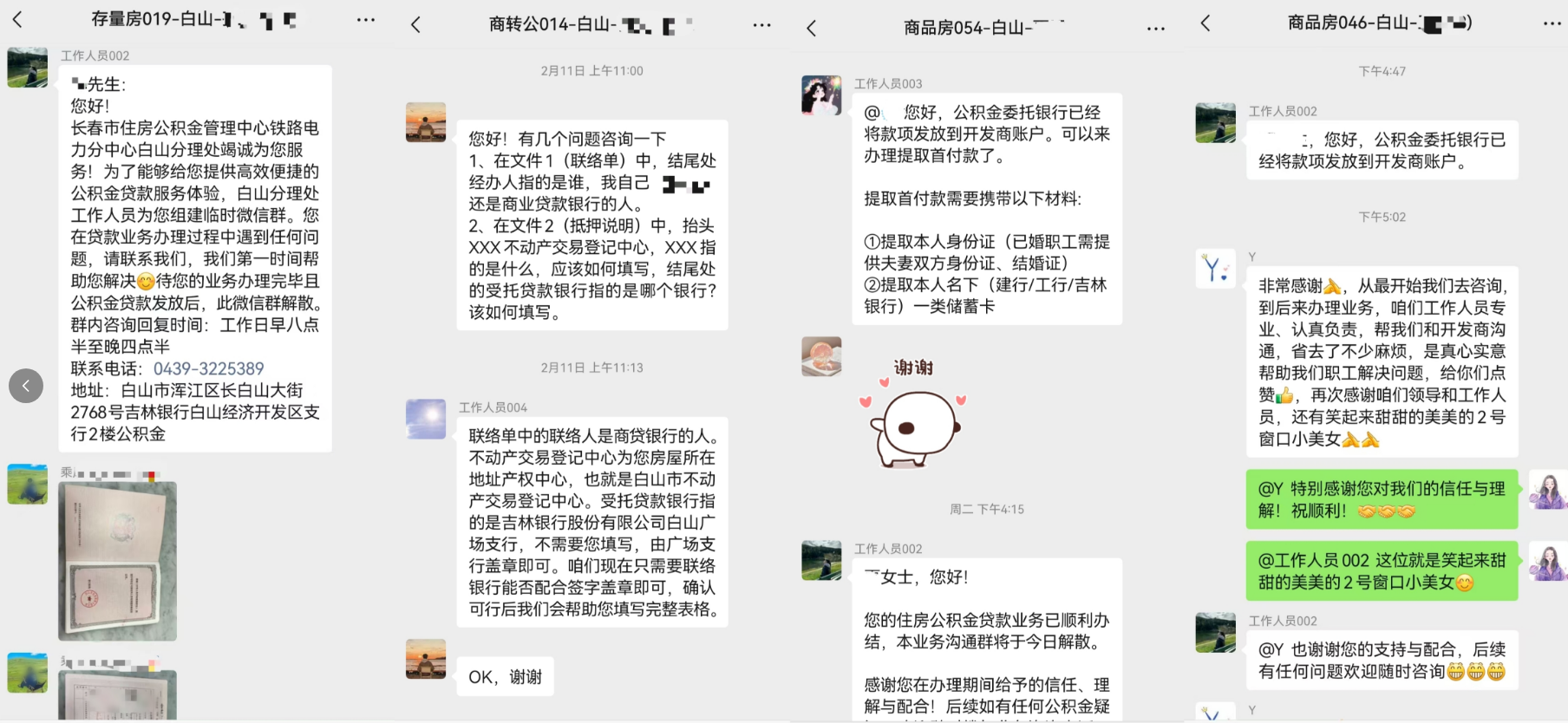 为切实提升贷款服务质效,长春市住房公积金管理中心铁路电力分中心白山分理处创新推行“一对一”专属微信群服务,主动对接职工需求,实现从“职工寻找服务”到“服务主动跟进”的转变,以“主动作为、精准沟通、即时响应”传递服务温度,让“惠民公积金、服务暖人心”的服务理念落到实处。