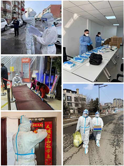 在华业社区,为解决雪后核酸检测点地面严重湿滑问题,志愿者主动想措施、寻办法,及时向本单位申请支援,取回单位地毯铺到检测点,为居民创造了安全便利的检测环境,受到社区书记肯定;在聚业社区,为核酸检测居民做扫码登记的志愿者在扫到红码后沉着冷静应对,立即启动应急预案实施分流隔离并报告社区,受到社区领导认可;在金宝社区,志愿者为92岁高龄老人、孕妇以及瘫痪在床等行动不便居民上门服务,参与管控公寓扫楼,帮助小区物业运送蔬菜包;在净月社区,志愿者勇敢冲锋,为密接、次密接住户发放试剂盒、张贴封条、解答沟通,协助社区管控人员违规流动;在丰裕社区,志愿者不辞辛苦落实“敲门行动”,爬楼挨家核对核酸检测人数,确保全员检测不落一人;在天泽社区,志愿者主动承接搬运设备、运送物资工作,并为检测点清理积雪积水;在润民社区,志愿者耐心细致给封控居民拨打电话核实自检结果,将重要情况记录上报社区;在潭南社区,志愿者主动配合医护人员上门为5个地点居民完成6轮2300人次核酸检测;在金海社区,中心党组成员带头与志愿者在中风险地区果敢逆行,帮助社区搬运、装配医疗物资、配备采样物品、发放试剂盒……